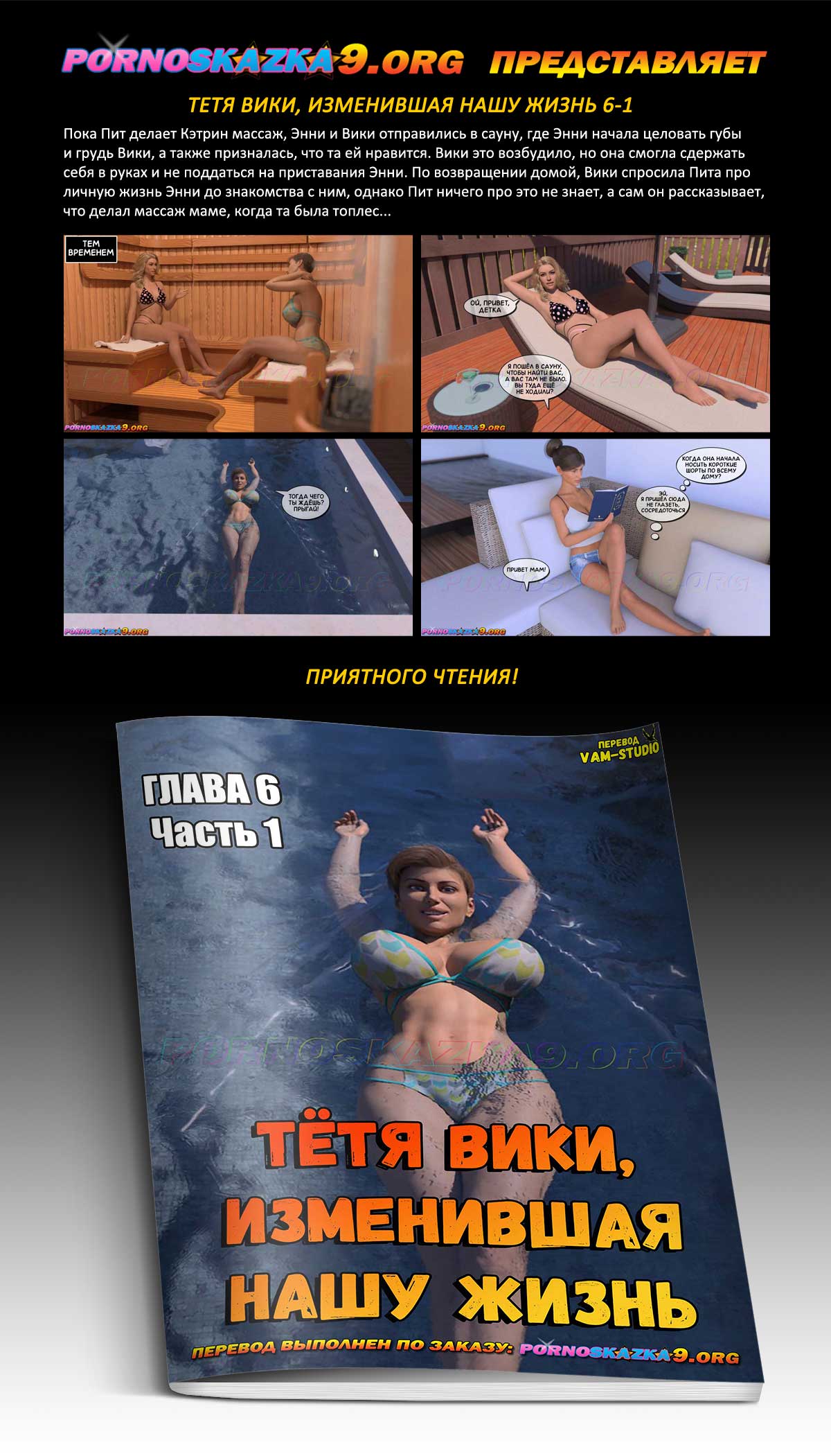 Порно комикс «Тетя Вики, изменившая нашу жизнь. Глава 6. Часть 1.» Пока Пит делает Кэтрин массаж, Энни и Вики отправились в сауну, где Энни начала целовать губы и грудь Вики, а также призналась, что та ей нравится. Вики это возбудило, но она смогла сдержать себя в руках и не поддаться на приставания Энни. По возвращении домой, Вики спросила Пита про личную жизнь Энни до знакомства с ним, однако Пит ничего про это не знает, а сам он рассказывает, что делал массаж маме, когда та была топлес…